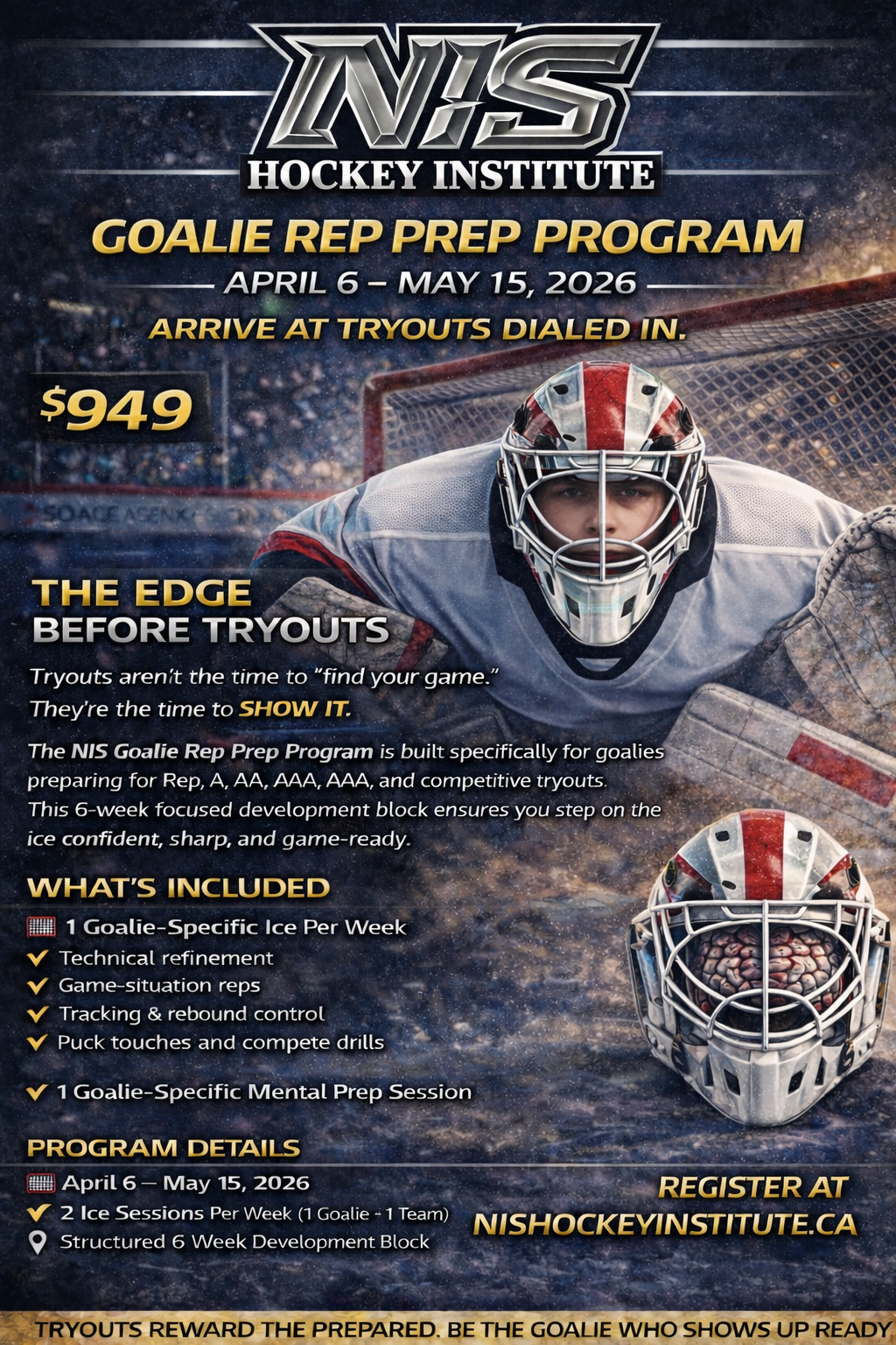 The NIS Goalie Rep Prep Program is built specifically for goalies preparing for Rep, A, AA, AAA, and competitive tryouts. This 6-week focused development block ensures you step on the ice confident, sharp, and game-ready.